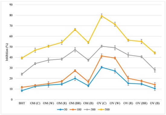 O. vulgare in the control possessed a high inhibition of β-carotene (79.3%). In this method, all extracts showed a greater ability to prevent oxidation of fatty acids than BHT at the same concentration (