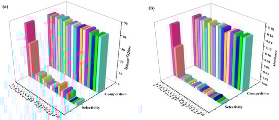 Selectivity and competition of probe RBg on Cu+ in Cu+ competing ion coexistence systems at the excitation wavelength of 380 nm: (a) fluorescence intensity ratio I586/I428 of the RBg-metal ion system; (b) absorbance at 563 nm of the RBg-metal ion system. The front row in (a,b): (a) fluorescence ratio I586/I428; and (b) absorbance at 563 nm of probe RBg upon the addition of various metal ions (RBg: 10 μmol L−1, metal ions: 40 μmol L−1). The rear row in (a,b): a subsequent addition of 40 μmol L−1 Cu+ to the front-row represented solutions in (a,b).
