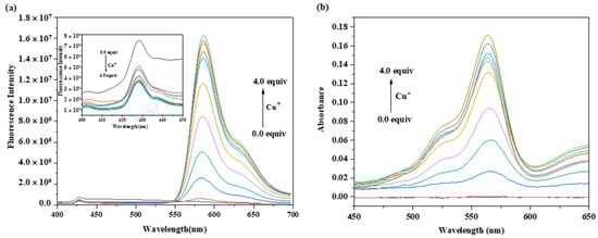Fluorescence and UV-Vis titration experiments were performed to analyze the quantitative relationship of probe RBg and Cu+. As a 10 μmol L−1 solution of RBg was gradually titrated with 0.0–4.0 equiv. Cu+, the enhancement for fluorescence (586 nm, Figure 2a) and UV-Vis absorbance (563 nm, Figure 2b) was resulted, accompanied by a contrary fluorescence decrease at 428 nm (Figure 2a, inset), which could be attributed to the ESIPT on–off and delocalized xanthene deformation–formation processes in probe RBg before and after Cu+ combination.