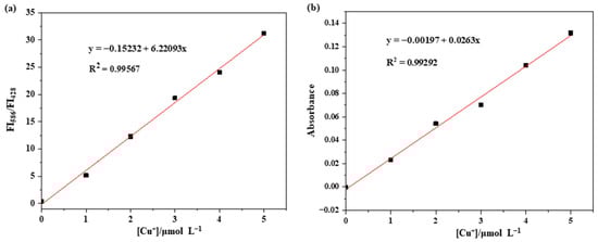 Linear relationships at the excitation wavelength of 380 nm: (a) fluorescence intensity ratio FI586/FI428 of the probe RBg versus [Cu+]; (b) absorbance at 563 nm of the probe RBg versus [Cu+].