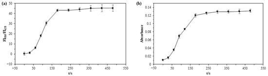 Time dependence of probe RBg and Cu+ at the excitation wavelength of 380 nm: (a) fluorescence intensity ratio FI586/FI428 versus time; (b) absorbance at 563 nm versus time (RBg: 10 μmol L−1, Cu+: 40 μmol L−1).