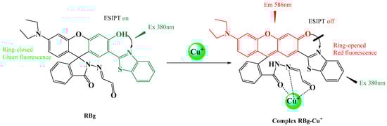 As illustrated in the fluorescence and UV-Vis titration spectra (Figure 2) before and after Cu+ combination, it can be inferred that an ESIPT on-off process in probe RBg was accompanied with the delocalized xanthene deformation–formation [25]. Specifically, an ESIPT on-off process was adopted by probe RBg to realize the recognition of Cu+ by relying on the intramolecular hydrogen bond between the phenolic hydroxyl group and the N atom of the thiazole ring in RBg (Figure 6). When the combination of RBg–Cu+ was accomplished through a spirocyclic-opening structural transformation, and accompanied with that were the delocalized xanthene formation and ESIPT off processes, resulting in a longer emission (red fluorescence, 586 nm) for the combined RBg–Cu+, due to the intramolecular hydrogen bond between the phenolic hydroxyl group and the N atom of the thiazole ring in RBg. In comparison with the 428 nm green fluorescence (in accordance with literatures) for the benzothiazole moiety at the state of ESIPT on, the ESIPT on-off processes, combined with the closing–opening spirocyclic ring, made the dynamic detection for Cu+ by RBg possible. Furthermore, release of the free and active proton in the phenolic hydroxyl group also contributed to the processes of ESIPT effect off and xanthene formation, leading to the recognition of RBg–Cu+.