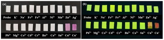 To explore the sensing and imaging behavior of the synthesized probe, RBg-loaded test strips were immersed into a series of one metal ion-containing aqueous solutions (containing Cu+ and other 18 metal ions, 5 μmol L−1 for Cu+ and 100 μmol L−1 for others) for 10 min and then imaged, respectively. As seen in Figure 8, whether the resulted test strips were located (a) under ambient light or (b) under the 365 nm ultraviolet lamp, only the Cu+ solution demonstrated obvious color changes and could be simultaneously distinguished by naked eyes and ultraviolet [26,27], presenting a potentially quick and compatible Cu+ colorimetric method sensitively happening on the probe-loaded test strips.