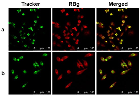 Through the bioimaging experiment for dynamic Cu+ tracking in HeLa cells, the accumulated areas of RBg in the cytoplasm were analyzed. By incorporating commercially available localization reagents, such as Mito-Tracker Green (Mito) and Lyso-Tracker Green (Lyso), the co-staining experiments of RBg–Mito/Lyso were performed, and lysosome targeting properties of the synthesized RBg were revealed. As displayed in Figure 10a, RBg + Cu+ and the lysosome-targeting reagent Lyso-Tracker Green, demonstrated a good overlap that presented large yellow patches. In contrast with Figure 10a, RBg + Cu+ and the mitochondria-targeting reagent MitoTracker Green, provided a poor overlap which is shown as the red/green patches in Figure 10b. Consequently, the co-staining bioimaging indicated that RBg could be used as an efficient lysosome-targetable probe for dynamic Cu+ imaging in living cells, providing potential tools for monitoring the function of lysosomes in the autophagy processes.