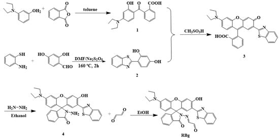 Compounds 1–4 in Scheme 1 were synthesized according to the reported methods and the structural characterizations of compounds 1–2, which were in accordance with the literature reports [28]. The obtained compd. 4 (0.534 g, 1.00 mmol) and glyoxal (0.058 g, 1.10 mmol) were then dissolved in ethanol (25 mL), and the mixture reacted in an N2 atmosphere at 80 °C for 24 h. After the reaction, the mixture was concentrated in vacuo and subsequently purified by column chromatography (silica gel, V (dichloromethane):V (hexane) = 2:1 as eluent) to afford the probe RBg.