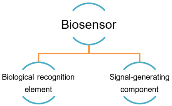 The high affinity of the recognition element to its target in the biosensor is a fundamentally important factor that contributes to the sensor’s reliable use, as it should interact with its target strongly. That is, high-performing biosensors are also defined by their ability to generate reproducible results with high sensitivity (i.e., low limit of detection) over a wide concentration range and in a linear fashion. Figure 2 summarizes the two main components of a typical biosensor and its mechanism. The recognition element interacts with the desired target based on its affinity, and then the interaction is converted into physically detectable signals by the signaling component [48,49,50].