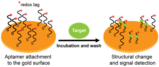 Antibodies are prone to denaturation (especially at high temperatures), frequently lose their functionality after use once or a few times, and are difficult to label at specific sites. Furthermore, assays that involve the utilization of antibodies often require immobilizations and extensive washing and are difficult to perform with homogeneity. Aptamers, on the other hand, are highly thermostable and renature easily after repetitive denaturation cycles, can be stored for longer periods of time (years), and can be repeatedly used without any loss of binding capacity. Their small size allows for achieving higher densities during immobilization. Aptamers can also be more sensitive compared to antibodies and, thus, are capable of differentiating target isoforms [69]. Finally, aptamers can be easily integrated onto solid supports such as polymer, carbon nanotube, and metals (e.g., gold) by means of electrostatic, hydrophobic, and covalent interactions as well as a self-assembled monolayer. Some linkers commonly used to carry out specific interactions for surface immobilization include biotin, streptavidin, avidin, neutravidin, and amine-, carboxyl- or thiol-groups [70,71,72].