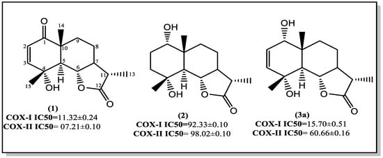 The results (Table 3) showed that vulgarin showed a good preferential inhibitory activity towards COX-2 and had a moderate effect on COX-1 (% of inhibition of COX-1 = 45.61%, COX-2 = 60.69%). Moreover, other compounds; (2), (3a), and (3a, b epimeric mixture) showed different % of inhibition of (COX-1, COX-2); (9.43%, 6.80%), (53.60%, 32.7%), and (48.40%, 26.17%), respectively. Metabolite (2) showed a weak inhibitory effect on COX-1 and COX-2 (Table 3). Metabolites (3a) and (3a, b) exhibited a selective inhibitory activity against COX-1 and had a weak effect on COX-2.