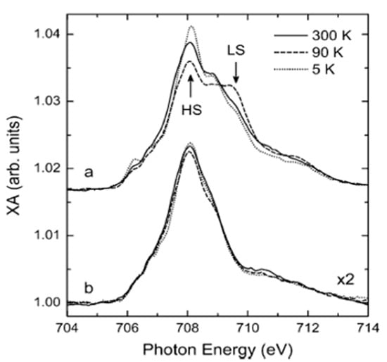 The Fe L3 edge NEXAFS spectra taken at 300 K, 90 K, and 5 K. (a) for 1.6 molecular layers and (b) for 0.8 molecular layers of [Fe(H2B(pz)2)2(phen)] on a Au substrate. Adapted with permission from reference [84].