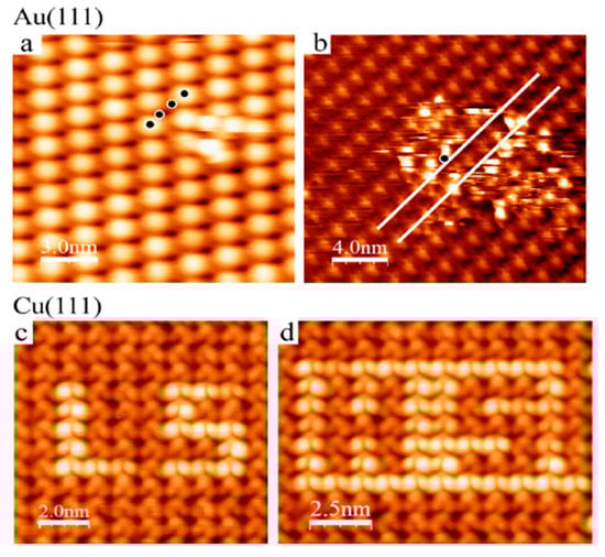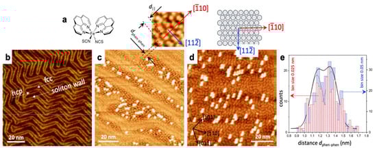 The spin states of [Fe(phen)2)(NCS)2] on Au(111) substrates in the sub-monolayer regime were mixed in a wide temperature range from 100 K to 300 K [85]. STM images show that sublimated [Fe(phen)2)(NCS)2] on Au(111) attaches to the Au through the NCS groups due to the strong affinity of sulfur binding to Au(111) which leads to the phen moieties pointing away from the Au surface. STM images of sub-monolayer [Fe(phen)2)(NCS)2] on Au (Figure 3a–d) showed that the [Fe(phen)2)(NCS)2] condenses into islands on the FCC sites of Au(111) with portions of the molecules in these regimes in the second layer just on top of the first layer islands. Compared to the Au surface in Figure 3b, the herringbone reconstruction is changed.