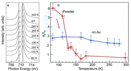 Ultraviolet photoelectron spectroscopy (UPS) measurements of [Fe(H2B(pz)2)2(bipy)] (bipy = 2,20–bipyridine) films, deposited on an Au(111), showed little evidence that the spin state occupancy changed at temperatures between 130 K and 300 K and this was attributed to the molecular packing effects that alter the cooperative effects compared to the bulk powder [86]. XAS indicated that while both the HS and LS states were represented, the low spin dominated over a temperature range beyond that associated with the spin transition of [Fe(H2B(pz)2)2(bipy)] molecules, when deposited on an Au(111) substrate [88]. XAS spectra of [Fe(H2B(pz)2)2(bipy)] thin films revealed that SCO molecules were in a mixed spin state at 340 K well above the typical transition temperature. After decreasing the temperature below the transition temperature, the spin state remained in a mixture of both HS and LS spin states (Figure 4a). The analysis of the XAS data for [Fe(H2B(pz)2)2(bipy)] revealed that the orbital occupation of eg and t2g is very sensitive to temperature. However, the occupation of the eg and t2g for [Fe(H2B(pz)2)2(bipy)], in a molecular bilayer film on Au(111), is independent of temperature as seen in Figure 4b. Here there is support for our contention that metals generally “lock” the spin state or mixed spin state and the spin crossover spin state change is suppressed.