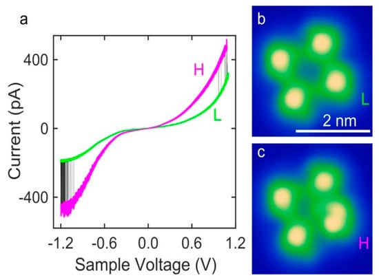 New functional Co-based SCO molecules, inspired by previous studies on Fe-based SCO molecules, opened another avenue for studying the effects of metallic substrates on the spin state transition. STM images of [Co(H2B(pz)(pypz))2] (py = pyridine, pz = pyrazole) molecular thin films deposited on Ag(111) substrates revealed that the molecules aggregate mostly into tetramers due to a bis (tridentate) coordination sphere [100]. [Co(H2B(pz)(pypz))2] tetramers on Ag(111) can exhibit a reversible spin transition between HS and LS states and can be stimulated by passing an external current through them or their neighbors. The current-voltage graph (Figure 6a) shows two spin states transitions that were measured repeatedly. While switching occurred at voltages greater than ±1 V, when the voltage was reduced, the spin state became locked (Figure 6b,c), indicating that a large external voltage stimulus is required for the spin state to change. Studies with [Fe(H2B-(pyrazole)(pyridylpyrazole))2] on an Ag(111) surface led to similar results [101,102].