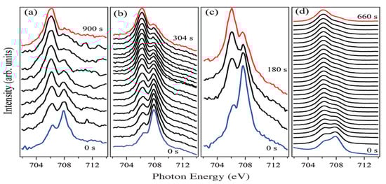 The XAS for thin films of [Fe(H2B(pz)2)2(bipy)] (a–c) on SiO2 and (d) on Al2O3 substrates, displaying time evolution of SOXIESST at (a) 200 K, (b) 290 K, and (c) 345 K for 5 nm films on SiO2. Comparable results are shown for (d) 30 nm films on Al2O3, at 294 K. From bottom to top, time increases, and the spin state changes from the LS state (blue) to the HS state (red). Adapted with permission from reference [77].