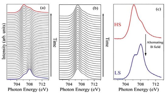 The time evolution of the XAS for a 10 nm thin film of [Fe(H2B(pz)2)2(bipy)] on LSMO. (a) The spin state changes from the LS state (blue) to the HS state (red) with time when exposed to X-rays and this occurs within 28 min. (b) De-excitation from HS to LS in an alternating magnetic field is not seen while subject to X-rays. (c) De-excitation occurs in the absence of X-rays in an alternating magnetic field. Adapted with permission from reference [103].