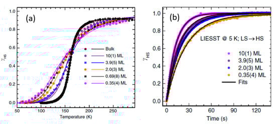 (a) The temperature-dependent spin crossover for different thicknesses of [Fe (bpz)-bipy] on highly oriented pyrolytic graphite compared to bulk; the dots are experimentally acquired data while the solid lines are fits that were derived from using the Slichter–Drickamer model. (b) The light-induced transition from LS to HS at 5 K for the different thicknesses [108].