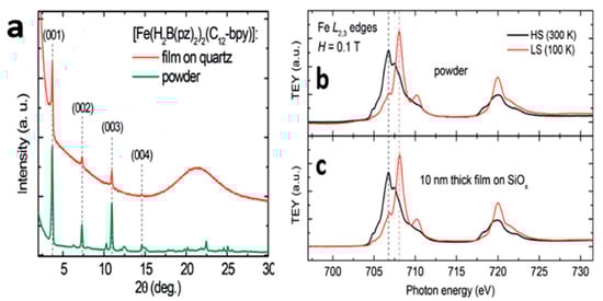 It was shown (Figure 11) that both temperature-dependent XAS and X-ray diffraction (XRD) spectra of [Fe(H2B(pz)2)2(C12-bpy)] thin films sublimated on glass substrates show the same SCO behavior as the powdered form [110], indicating that not only was the thin film sublimation a success (Figure 11a), but also the same behavior as the bulk molecule was witnessed (Figure 11b,c).