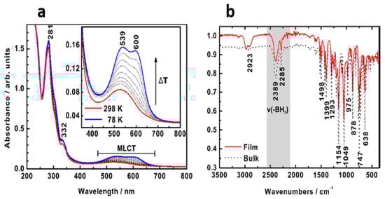 (a) The temperature-dependent UV-vis of a film of [Fe(H2B(pz)2)2(phenme4)] on a quartz disk at 298 K (red line) and 78 K (blue line). Gray: temperatures between 298 K and 78 K (b) The Fourier transform infrared (FT-IR) spectra of the bulk material (black dotted line) and the-deposited form (red line) of [Fe(H2B(pz)2)2(phenme4)] at 298 K. Adapted with permission from reference [89].