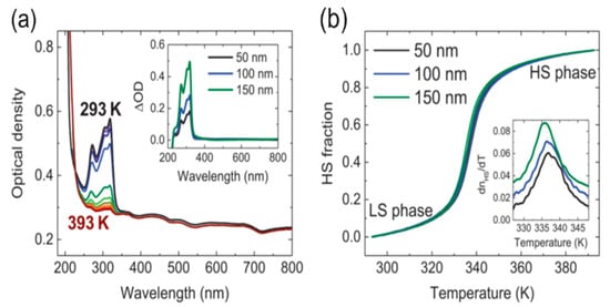 [Fe(HB(trz)3)2] spin crossover thin films deposited on silica substrates, with thicknesses, 50 nm, 100 nm, and 150 nm, were successfully switched between the two spin states by altering the temperature [113]. While the transition temperature is well above RT (375 K) and initially the molecule is in LS, optical absorbance spectra revealed that the molecule was switched to HS by increasing the temperature. This behavior indicates that switching is independent of film thickness (Figure 13).