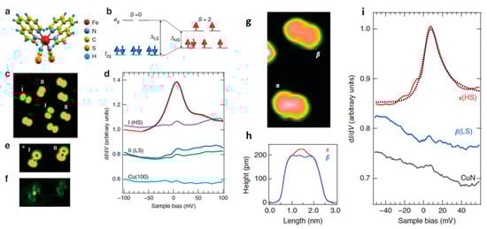 A study done by Miyamachi et al. revealed that surface interactions can be affected by having an interfacial layer. A film of [Fe(phen)2)(NCS)2] deposited on a thin interfacial layer of CuN on a Cu(100) surface significantly decreases the interaction between surface and molecule and allows the [Fe(phen)2)(NCS)2] to switch from HS to LS and vice versa due to a reduction of the adsorption energy [71]. By using STM, the stimulus was focused on the area of current flow which demonstrates electronic switching of the spin state. While Fe-phen molecules sublimated onto a Cu(100) surface showed mixed HS and LS states due to the strong coupling of the NCS group to the substrate, it prevented electronic switching of the spin state. However, a thin CuN layer deposited on Cu(100) allowed switching between the HS and the LS state. A monoatomic CuN layer dramatically reduces the adsorption energy and ensues hybridization, reducing the chemical interaction between molecule and substrate and weakening the bond of sulfur to the oxidized Cu atoms in the CuN network. As with Cu(100), STM images (Figure 14), revealed that [Fe(phen)2)(NCS)2] adsorbs with the NCS groups onto the CuN surface, and two types of molecular conformations (α and β) were observed. Due to the electronic decoupling of the molecules, the difference in the molecular shape seen by STM was dramatically smaller when compared with that on bare Cu. Figure 14h shows two slightly different height profiles in the center region, with type α higher than that of type β. Figure 14i represents the dI/dV spectra near the Fermi energy on the center of both types demonstrating a clear Kondo resonance only on type α and also a weak spectroscopic property on type β. Except for CuN, similar studies show sublimated SCO complexes on the family surface group like Cu2N preserve their functionality [114].