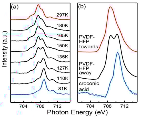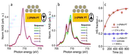 [Fe(H2B(pz)2)2(bipy)] complexes deposited on differently poled ferroelectric PMN-PT ([Pb(Mg1/3Nb2/3)O3]1−x[PbTiO3]x, x = 0.32) characterized by X-ray absorption spectroscopy revealed temperature-driven conversion between HS and LS states with no observable effect of the ferroelectric polarization on the spin state of the molecules down to 100 K [127]. However, at 3 K, large differences were noticed between the two ferroelectric polarizations. At this temperature, the efficiency of X-rays exciting the molecules to the HS state was more than an order of magnitude larger when the ferroelectric dipoles of the substrate were pointing toward the surface, compared to the opposite polarization. SOXIESST in the thin film samples at 3 K exhibited no SOXIESST on the (−) poled substrate, whereas on the (+) poled sample, a significant HS fraction appears within minutes of irradiation. Figure 16a,b display two sequences of six X-ray absorption spectra each on negative and positive PMN-PT. These results were confirmed in the HS fractions overtime plot (Figure 16c). Surprisingly, the high spin state of [Fe(H2B(pz)2)2(bipy)] favors the ferroelectric being poled “up” and the low spin state favors the oxide ferroelectric being poled down [127], which was also seen for [Fe(H2B(pz)2)2(bipy)] on the organic ferroelectrics PVDF-HFP and PVDF-TrFE [7,8,9,126].