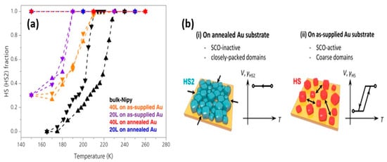 The effect of surface morphology on the SCO complex [Fe(py)2[Ni(CN)4]] was established by comparing the SCO behavior when on annealed and unannealed (as-supplied) Au substrates [138]. The spin transition curves of [Fe(py)2[Ni(CN)4]] are shown in Figure 18a,b for thin films on as-supplied substrates and the transition temperature shifted to lower temperatures with the more imperfect substrate crystallite domain size decreased. On the other hand, 40-layer and 20-layer thin films deposited on annealed Au substrates showed no SCO phenomena when changing the temperature.