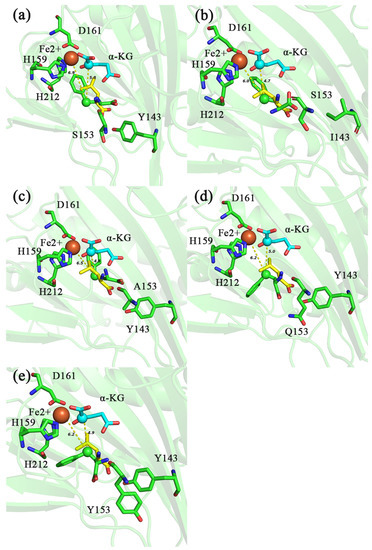 The molecular docking results showed that the distance of C4 of HPHE from Fe2+ and C2 of α-KG in IDO-WT was 6.9 and 5.8 Å, respectively (Figure 7a), while the distance of C4 of HPHE from Fe2+ in mutants Y143I, S153A, S153Q and S153Y were 6.0, 6.5, 6.2 and 6.2 Å, respectively (Figure 7b–e), and the distances to C2 of α-KG were 4.7, 4.8, 5.0 and 4.9 Å (Figure 7b–e), respectively. This indicated that C4 of HPHE in the mutant was closer to Fe2+ and C2 of α-KG than that in the wild type, which would be more favorable for C4 of HPHE to be attacked. Moreover, the binding free energy analysis showed that the binding free energies of Y143I, S153A, S153Q and S153Y to HPHE (−6.6, −6.5, −6.4 and −6.5 kcal/mol) were slightly lower compared to IDO-WT (−6.3 kcal/mol) (Table 4). Taken together, these site mutations may be more favorable for hydroxylation on C4 of PHE.