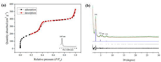 Powder X–ray diffraction (PXRD) data were measured by a D8 ADVANCE X–ray powder diffractometer (Rigaku, Tokyo, Japan) under Cu Kα radiation (λ = 1.5405 Å). The range was from 2θ = 2.0° up to 30°. Scanning electron microscope (SEM) images were recorded on a SWPRATM55 scanning electron microscope (Carl Zeiss, AG, Aalen, Germany). The FT–IR data were obtained ranging from 500 to 3700 cm−1 on a Nicolet 710 spectrometer (Waltham, MA, USA). The N2 adsorption–desorption experiments were performed on a Kubo–X1000 analyzer (Bjbuilder, Beijing, China). The Brunauer−Emmett−Teller (BET) method was applied to calculate the surface area and pore volume. The pore size distribution was calculated with the Barrett−Joyner−Halenda model. Thermogravimetric (TG) analysis was performed from room temperature to 850 °C on the STA 449F3–QMS403C system (Netzsch, Germany). The X–ray photoelectron spectroscopy (XPS) was conducted using an ESCALAB 250XI imaging electron spectrometer (Thermo, Waltham, MA, USA). A Vario EL III analyzer (Elementar, Germany) was used to perform the elemental analysis.