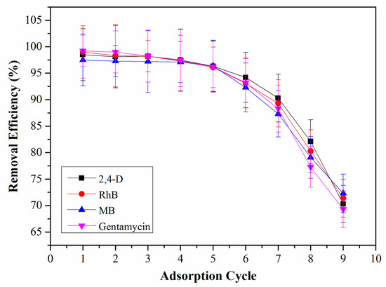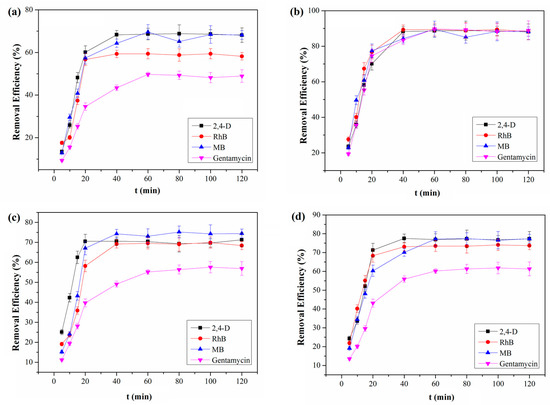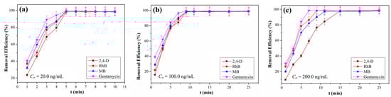 Our obtained QCA–COF can be qualified as potential adsorbents for removing organic pollutants from water due to their intrinsic acidic and basic functions along with different aromatic nuclei. Thus, QCA–COF is used to evaluate its removal function of highly water–soluble contaminants, involving 2,4–D, RhB, MB, and gentamycin from water. The analysis details of four contaminants are shown in Supplementary Materials (Tables S3–S6). Delightedly, we found that all four organic pollutants can be removed >98% within 5 min, 9 min, and 15 min at 20.0 ng/mL, 100.0 ng/mL, and 200.0 ng/mL (Figure 3a–c), respectively.