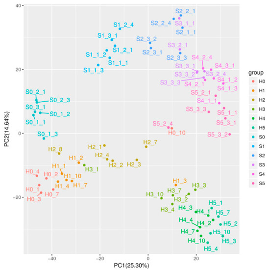 The metabolites of two Coix cultivars at six developmental stages were detected via LC-QTOF-MS. A total of 1723 compounds were obtained from 72 Coix samples (Table S1), of which 314 compounds were identified (Figure S1, Table S2). The total ion current (TIC) overlap rate of the quality control samples was high (Figure S2), and the retention time and peak area stability of the internal standard (IS) were also good (Figure S3), which indicated that the instrument data acquisition stability was good and that the experimental results were reliable. In order to better understand the nutritional and medicinal changes in feeding and edible Coix seeds during development, principal component analysis (PCA) was performed on the metabolites of 72 Coix seed samples to provide information on the overall metabolic differences between each group and the variation degree between samples within the groups. As shown in Figure 1, the accumulation patterns of metabolites in Coix fruits of different cultivars were quite different.