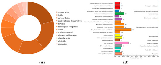 Metabolites in different cultivars of Coix seeds: (A) Types of the identified metabolites from DHS and XBK. (B) Enrichment analysis of metabolite KEGG in Coix lachryma-jobi L.