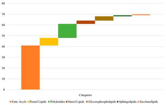 The lipid in Coix seeds is the key to evaluating the medicinal quality of Coix [29]. Seven lipids were observed from the metabolites in the annotations in the Lipidmaps database, as shown in Figure 3 and Table S4. The fatty acids were fatty acyls (41), prenol lipids (7), polyketides (13) and sterol lipids (3), glycerophospholipids (4), sphingolipids (1) and saccharolipids (1). Fatty acids in plants are an important part of lipids, and it was observed that the fatty acids in Coix lachryma-jobi L. could be divided into saturated fatty acids and unsaturated fatty acids according to unsaturation. It is worth noting that the free fatty acids in Coicis seeds can be divided into even- and odd-chain fatty acids (tridecanoic acid, pentadecanoic acid, heptadecanoic acid, heneicosanoic acid and tricosanoic acid) according to the number of carbon atoms. This is the first time that multiple species of odd-chain fatty acids have been observed in Coix seeds.