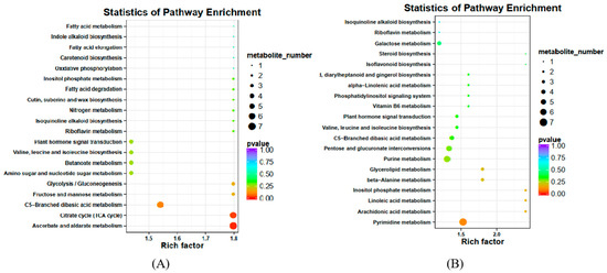 Statistics of pathway enrichment of differential metabolites in two varieties: (A) Statistics of pathway enrichment of differential metabolites in XBK. (B) Statistics of pathway enrichment of differential metabolites in DHS.