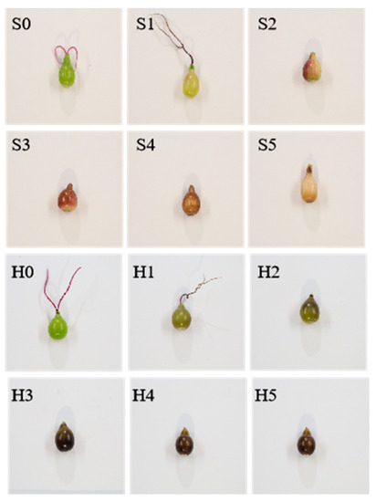 The two Coix varieties were identified by the Maize Research Institute of Sichuan Agricultural University in this study. Coix was obtained from wild aquatic Coix (C. aquatica) in Gasa Town (100°45′43″ N, 21°57′22″ E), Jinghong City and Yunnan Province through 7 generations of selfing. Another material is Xiaobaike Coix (C. chinensis) from Xingren County (100°54′ N, 25°16′ E), Guizhou Province, China, which is an annual conventional plant widely grown in southern China. During the growth stage, both varieties were under the same field management conditions. Samples were collected every 7 days from fertilization until fruit ripening, and a total of 6 periods were obtained. A total of 6 periods (0, 1, 2, 3, 4 and 5) were obtained. All samples were selected for 6 biological replicates in each period (Figure 9). This is the entire period of Coix fruit ripening, and all samples were frozen in liquid nitrogen and kept in a −80 °C freezer for further use.