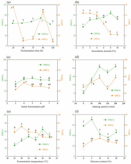 Effects of fermentation conditions on DM and DP of fermented products inoculated with L. fermuntum. (a) Fermentation time, (b) inoculation amount, (c) initial fermentation pH, (d) shaking speed, (e) fermentation temperature, and (f) addition of glucose content. Different lower and capital letters indicated significant differences for % DM and % DP among groups (p < 0.05), respectively.