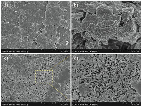 FESEM images of fermented chitin from 95 h of L. fermuntum fermentation (SBsL) as compared to chitin samples. (a) Commercial chitin (CC); (b) shrimp by-products powder (SBs); (c,d) fermented chitin observed under different magnifications.