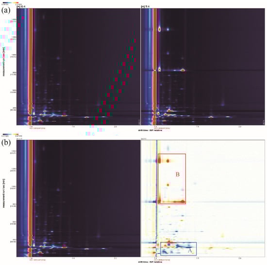 Taking SBs as the reference, the signal peaks in SBsL were subtracted to obtain the differentiation spectra in detail. The blue area (as shown in area A in Figure 5b) and red area (as shown in area B in Figure 5b) indicated lower and higher concentrations of volatile compounds in SBsL, respectively, compared to SBs. Similarly, the darker the color, the greater the difference between them. Obviously, shrimp by-products that underwent L. fermuntum fermentation not only promoted the production of some volatile compounds, but they also reduced the content of some volatile substances. These volatile compounds, detected in the two-dimensional GC–IMS spectra of SBsL, were well separated. Higher intensities of specific volatile compounds (red spots) appeared at the retention time from 200–400 s and 800–1400 s. However, lower intensities of volatile compounds (blue spots) mainly concentrated in the region of 200–400 s retention time.
