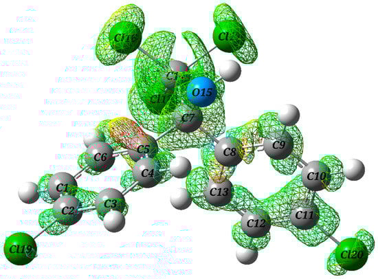 The proton reaction in the in-source fragmentation of dicofol was explored by Density Functional Theory [28]. The density functional theory is an effective method for studying a molecule’s reactivity and selectivity. Fukui function, which indicates the propensity for electron density to deform at a given position upon accepting or donating electrons, is one of the most fundamental and widely used techniques for predicting local reaction parameters [29,30]. Fukui function provides information about the electrophilic/nucleophilic power of any atomic site in a molecule. According to the definition of the dual descriptor, if Df(r) > 0, then the site is prone to nucleophilic attack, and the site is prone to electrophilic attack when Df(r) < 0.