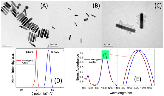 (A) TEM images of AuNRs. (B,C) TEM images of AuNRs@PEG. (D) ζ-potential measurements of AuNRs and AuNRs@PEG. (E) UV-vis-NIR absorption spectra of AuNRs and AuNRs@PEG.