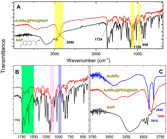 (A) IR spectra of AuNRs@PEG@NAP (red line) and NAP (black line) where three distinctive areas (highlighted with yellow) present bands related to the PEG polymer (see text for details). (B) IR spectra of AuNRs@PEG@NAP (red line) and NAP (black line) in the region 1800–400 cm−1) where two areas (highlighted with purple and violet) present bands related to the PEG polymer and another one highlighted with green confirms the effective loading of NAP (see text for details). (C) IR spectra of originally CTAB synthesized AuNRs (blue line), AuNRs@PEG@NAP (red line), and NAP (black line) in the region 3800–2700 cm−1 (see text for details).
