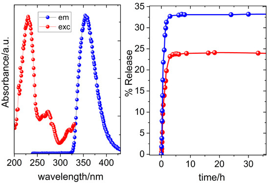 (left) Excitation spectrum of AuNRs@PEG@NAP at λem = 359 nm (red solid spheres) and emission spectrum of AuNRs@PEG@NAP at λexc = 233 nm (blue solid spheres); (right) release of NAP at pH = 6.8 (blue solid spheres) and at pH = 4.2 (red solid spheres).