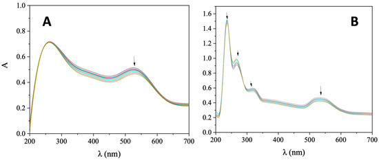 UV-vis spectroscopic titrations were employed initially to assess the interaction between CT DNA and AuNRs@PEG and AuNRs@PEG@NAP, in order to gain information on the mechanism and the intensity of this interaction. During such UV-vis spectroscopic titration investigations, the UV-vis spectra of AuNRs@PEG and AuNRs@PEG@NAP were recorded in the presence of increasing amounts of CT DNA. More specifically, in the UV-vis spectrum of AuNRs@PEG, the band observed at 525 nm (Figure 4A) exhibited in the presence of CT a slight hypochromism accompanied by a slight red shift (Table 1). In the UV-vis spectrum of AuNRs@PEG@NAP, two basic bands were observed (Figure 4B); band I at 530 nm which may be attributed to the presence of a Au-nanorod since it was also found for AuNRs@PEG and band II at 319 nm which may be assigned to the presence of naproxen, as also found in reported naproxen complexes [35,36,37,38,39]. In the presence of CT DNA, these two bands showed a slight hypochromism up to 10% followed by a slight bathochromism (Table 1). Such features may indicate the interaction of AuNRs@PEG and AuNRs@PEG@NAP with CT DNA, although the possible interaction mode may not be concluded safely.