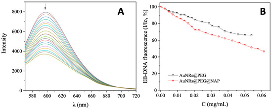 EB is a typical DNA intercalator with a known DNA-binding constant (Kb = 1.23 (±0.07) × 105 M−1) [52]. An indication of its DNA intercalation is the appearance of a strong fluorescence emission band at 592 nm, upon excitation of its solution at 540 nm [53]. A DNA intercalator may displace EB from the EB–DNA adduct resulting in a quenching of the EB–DNA fluorescence emission band. In the present case, the EB–DNA adduct was prepared by the 1 h pre-treatment of a solution containing 20 µM EB and 26 µM CT DNA. The addition of AuNRs@PEG and AuNRs@PEG@NAP in increasing amounts results in a quenching of the EB–DNA band (Figure 6 and Figure S5) which was more intense in the presence of AuNRs@PEG@NAP (up to 46.6% of the initial EB–DNA fluorescence) (Table 3). This quenching is obviously a result from the displacement of EB from the EB–DNA due to the competition with AuNRs@PEG@NAP for the DNA intercalation sites.