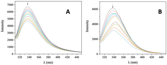 Fluorescence emission spectra (λexcitation = 295 nm) for ΒSA ([ΒSA] = 3 μM) in buffer solution (150 mM NaCl and 15 mM trisodium citrate at pH 7.0) in the absence and presence of increasing amounts of (A) AuNRs@PEG and (B) AuNRs@PEG@NAP. The arrow shows the changes of intensity upon increasing amounts of AuNRs@PEG and AuNRs@PEG@NAP.
