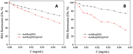 (A) Plot of relative fluorescence emission intensity of BSA at λemission,max = 339 nm (I/Io, %) versus the concentration of AuNRs@PEG and AuNRs@PEG@NAP (up to 69.2% of the initial BSA fluorescence for AuNRs@PEG (black line), and 51.1% for AuNRs@PEG@NAP (red line). (B) Plot of relative fluorescence emission intensity of HSA at λemission,max = 337 nm (I/Io, %) versus the concentration of AuNRs@PEG and AuNRs@PEG@NAP (up to 74.6% of the initial HSA fluorescence for AuNRs@PEG (black line), and 34.5% for AuNRs@PEG@NAP (red line).