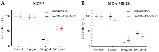 In order to evaluate the biological effect of AuNRs@PEG and AuNRs@PEG@NAP, cytotoxicity studies were performed on two breast cancer cell lines: the low metastatic MCF-7 cells, and the more aggressive MDA-MB-231 cells. More specifically, AuNRs@PEG and AuNRs@PEG@NAP were used at a concentration of 1, 50, and 200 μg/mL and the cells’ viability was subsequently determined.