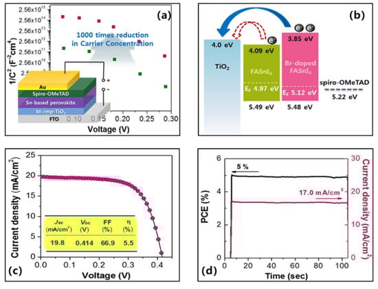 - Lee, S.J.; Shin, S.S.; Im, J.; Ahn, T.K.; Noh, J.H.; Jeon, N.J.; Seok, S.I.; Seo, J. Reducing Carrier Density in Formamidinium Tin Perovskites and Its Beneficial Effects on Stability and Efficiency of Perovskite Solar Cells. ACS Energy Lett. 2018, 3, 46–53. [Google Scholar] [CrossRef]