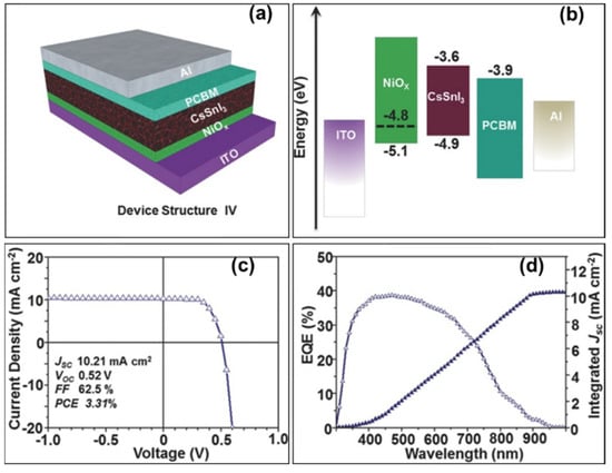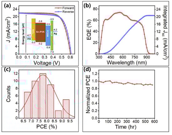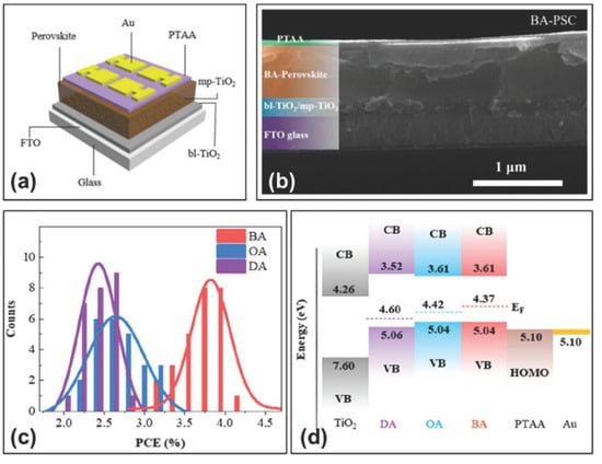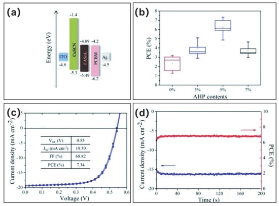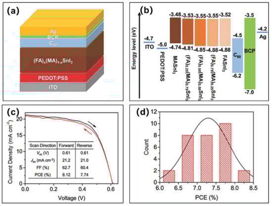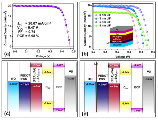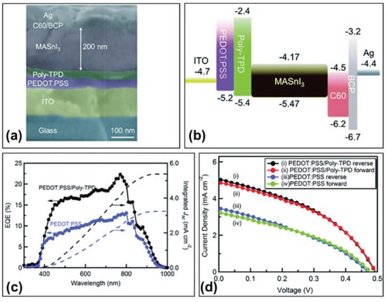 - Liu, X.; Wang, Y.B.; Xie, F.X.; Yang, X.D.; Han, L.Y. Improving the Performance of Inverted Formamidinium Tin Iodide Perovskite Solar Cells by Reducing the Energy-Level Mismatch. ACS Energy Lett. 2018, 3, 1116–1121. [Google Scholar] [CrossRef]