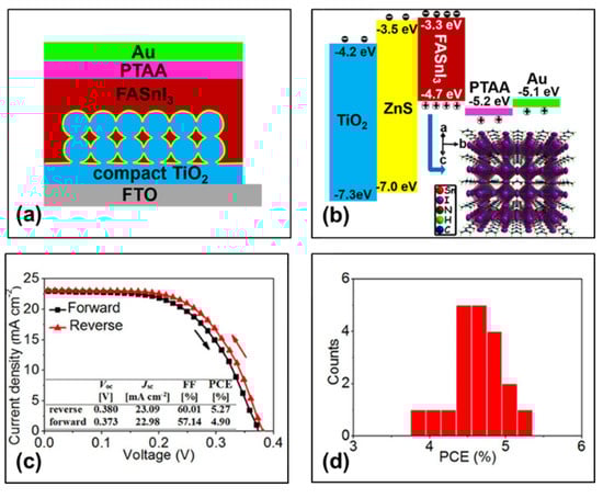 - Ke, W.J.; Stoumpos, C.C.; Logsdon, J.L.; Wasielewski, M.R.; Yan, Y.F.; Fang, G.J.; Kanatzidis, M.G. TiO2-ZnS Cascade Electron Transport Layer for Efficient Formamidinium Tin Iodide Perovskite Solar Cells. J. Am. Chem. Soc. 2016, 138, 14998–15003. [Google Scholar] [CrossRef]