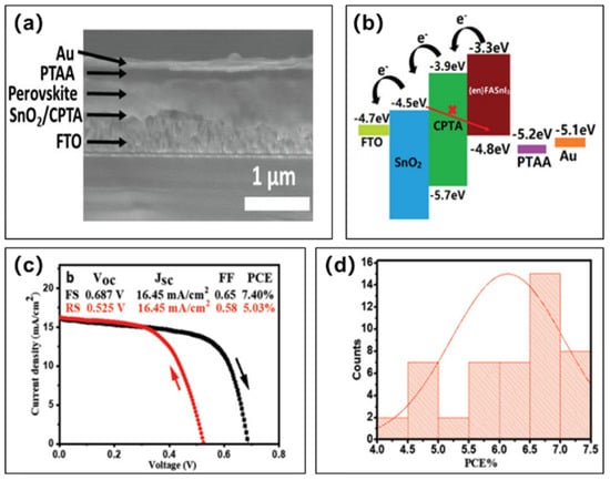- Yang, Z.; Zhong, M.; Liang, Y.; Yang, L.; Liu, X.; Li, Q.; Zhang, J.; Xu, D. SnO2-C60 Pyrrolidine Tris-Acid (CPTA) as the Electron Transport Layer for Highly Efficient and Stable Planar Sn-Based Perovskite Solar Cells. Adv. Funct. Mater. 2019, 29, 1903621. [Google Scholar] [CrossRef]