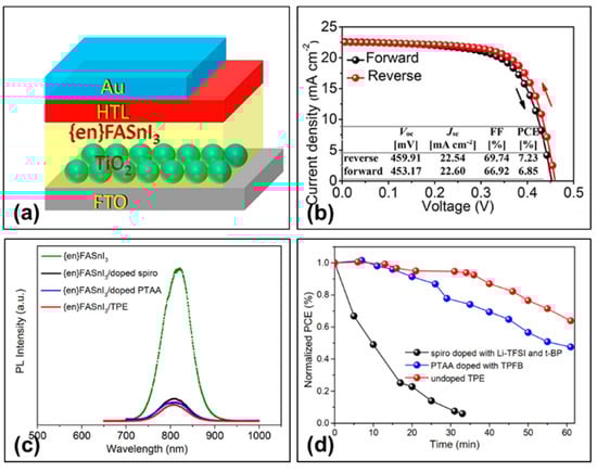 - Ke, W.J.; Stoumpos, C.C.; Spanopoulos, I.; Mao, L.; Chen, M.; Wasielewski, M.R.; Kanatzidis, M.G. Efficient Lead-Free Solar Cells Based on Hollow {en}MASnI3 Perovskites. J. Am. Chem. Soc. 2017, 139, 14800–14806. [Google Scholar] [CrossRef]